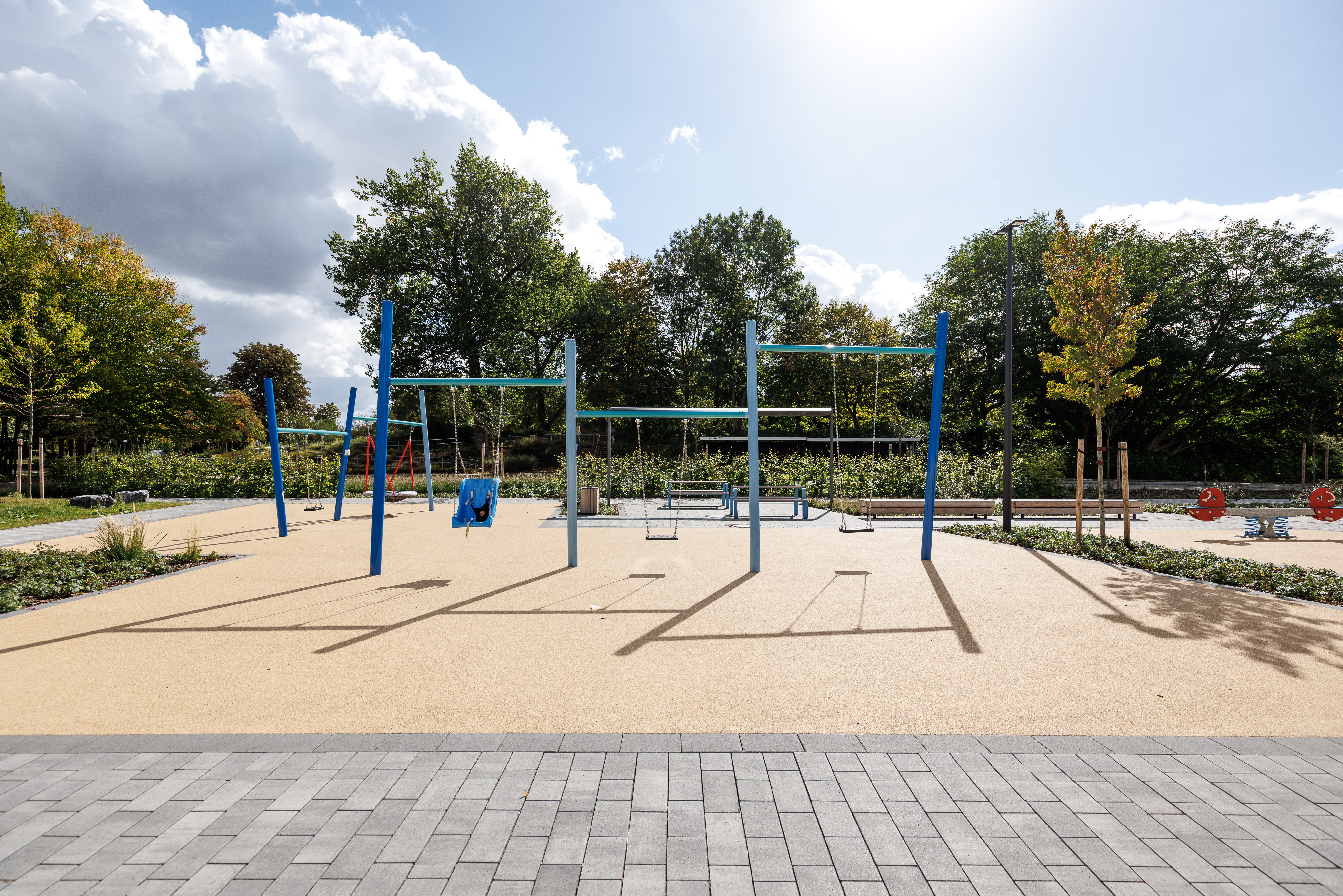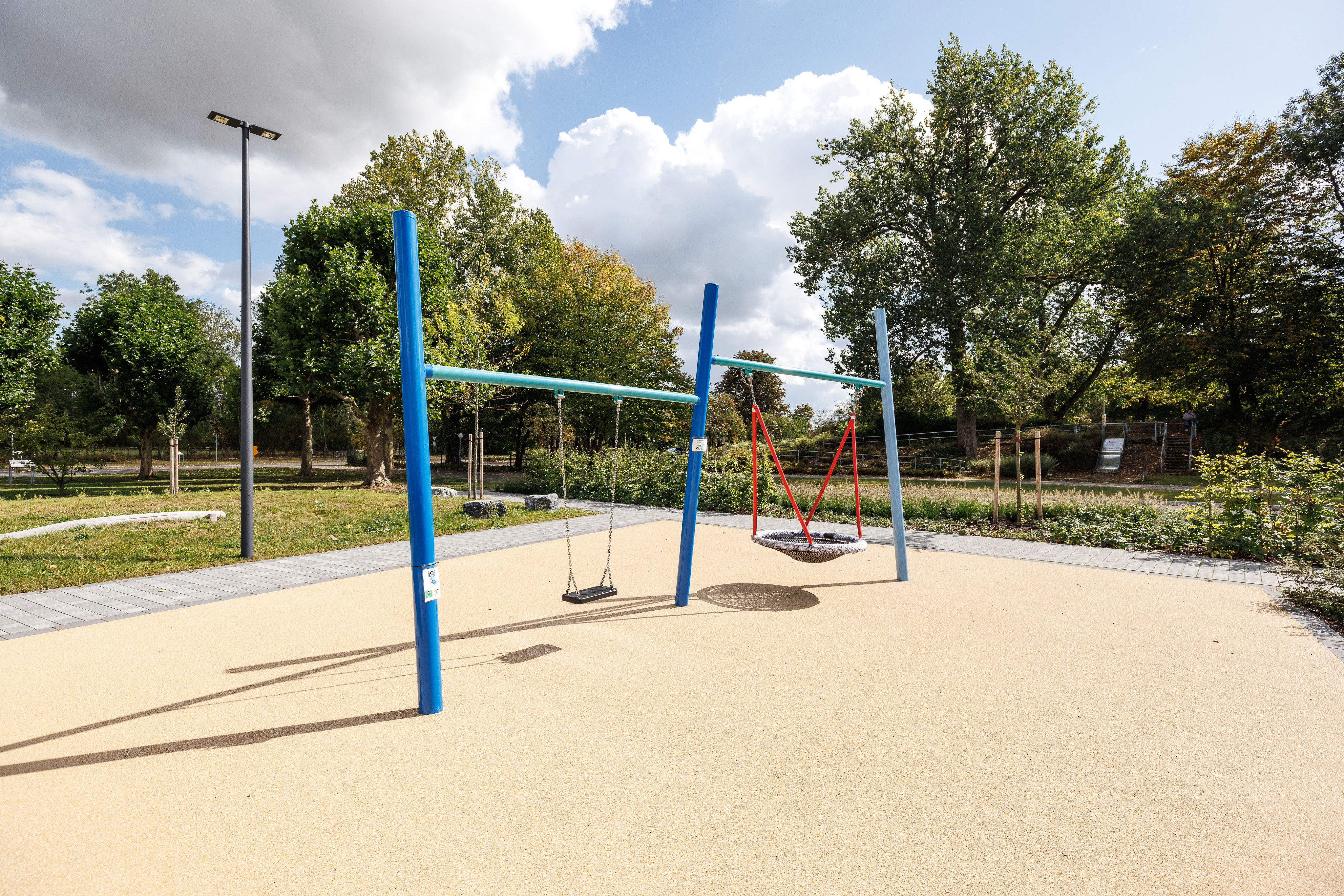 Auf dem Schulhof der LWL-Liboriusschule in Paderborn ist eine moderne inklusive Spiellandschaft entstanden, die allen Schülerinnen und Schülern – unabhängig von motorischen oder sensorischen Fähigkeiten – vielfältige Spiel- und Bewegungsmöglichkeiten eröffnet.