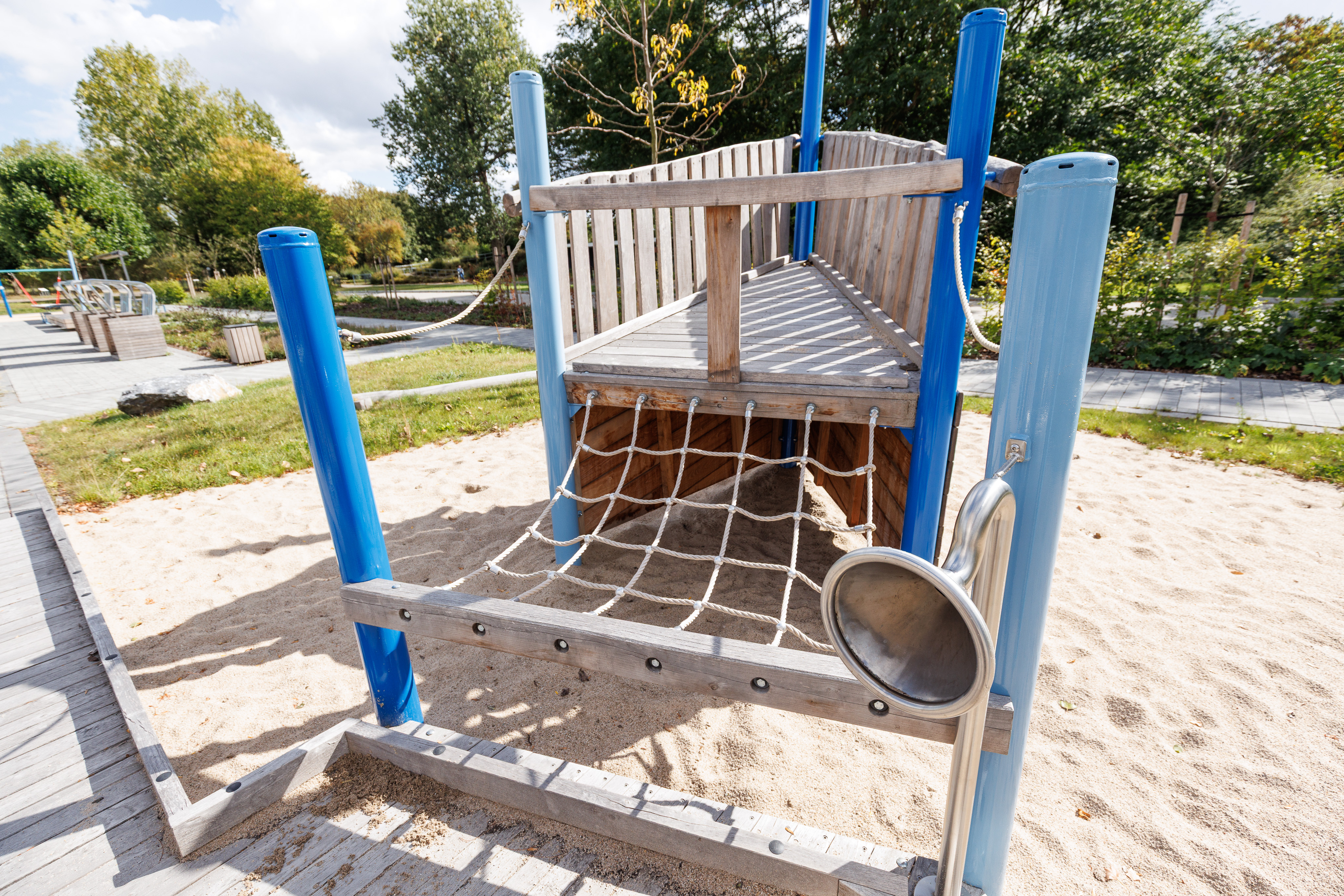 Das neue Spielschiff wurde bewusst barrierearm gestaltet: breite Rampen, gut erreichbare Spielbereiche und klar erkennbare Strukturen ermöglichen es auch Kindern mit körperlichen Einschränkungen, aktiv am Spiel teilzunehmen. Unterschiedliche Ebenen und ertastbare Materialien bieten zusätzliche Sinnesreize und fördern eigenständiges Erkunden.